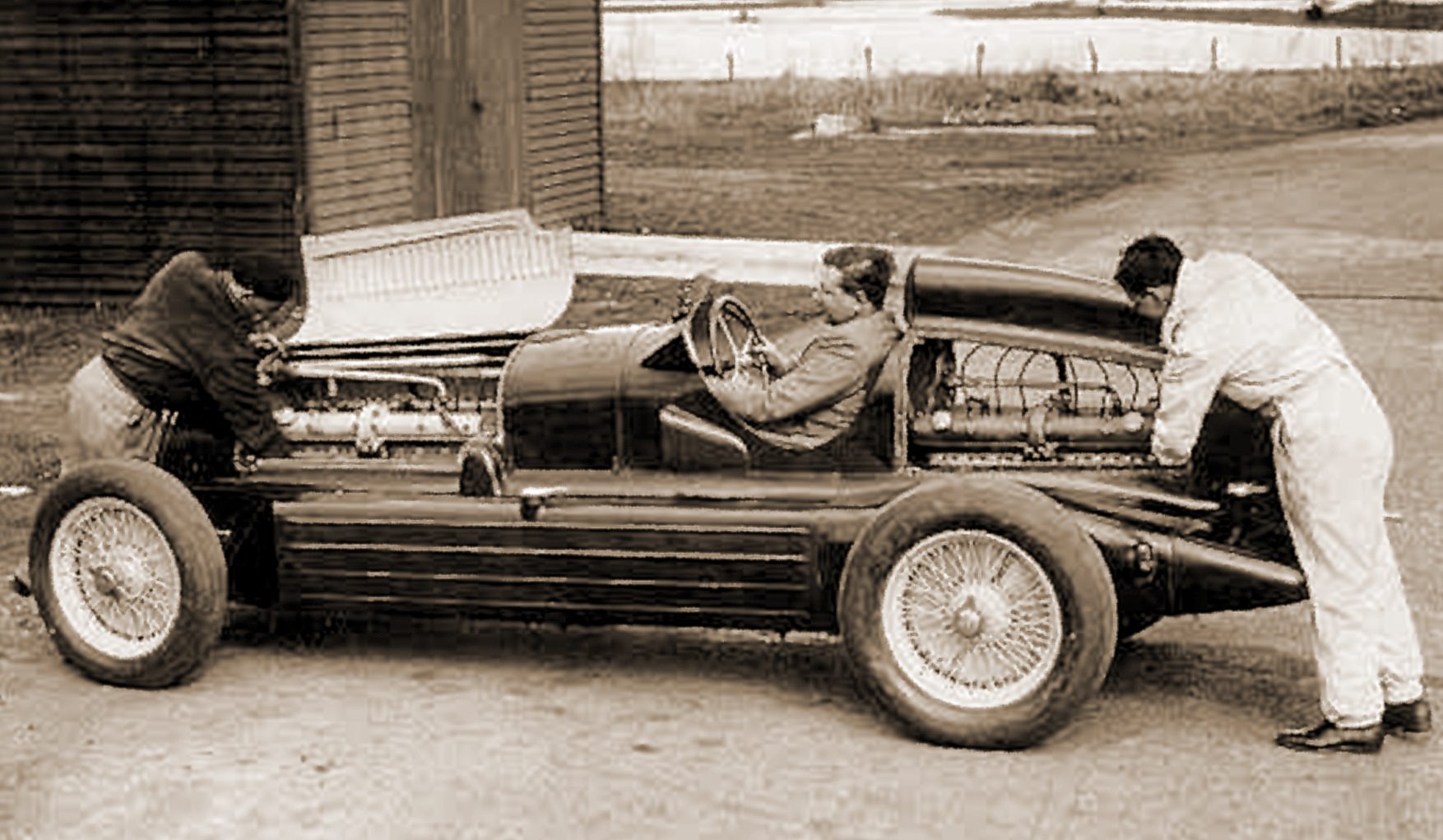 » Во 1935 година кога Scuderia Ferrari беше (полу)официјален тркачки тим на Alfa Romeo, Енцо Ферари, сакајќи на своите возачи да им даде доволно моќен автомобил за да се борат со конкуренцијата од Auto Union и Mercedes, реши да се направи болид со два мотора. Времето беше кратко, но идејата изводлива – во шасијата на тркачкиот едносед Alfa Romeo P3, еден од моделите од успешната 8C серија, беа вградени два линиски осумцилиндрични мотори со волуметриски компресори кои вкупно имаа 6,3 литри и 540 коњски сили. Двата мотора, еден сместен на вообичаеното место пред возачот а вториот зад него, беа споени на уникатен начин – силата од задниот мотор се пренесуваше преку карданско вратило кое минуваше низ менувачот директно до замаецот на предниот мотор. Заедничката сила, од диференцијалот поврзан на тристепениот менувач се пренесуваше на задните тркала со две полуоски поставени во V.