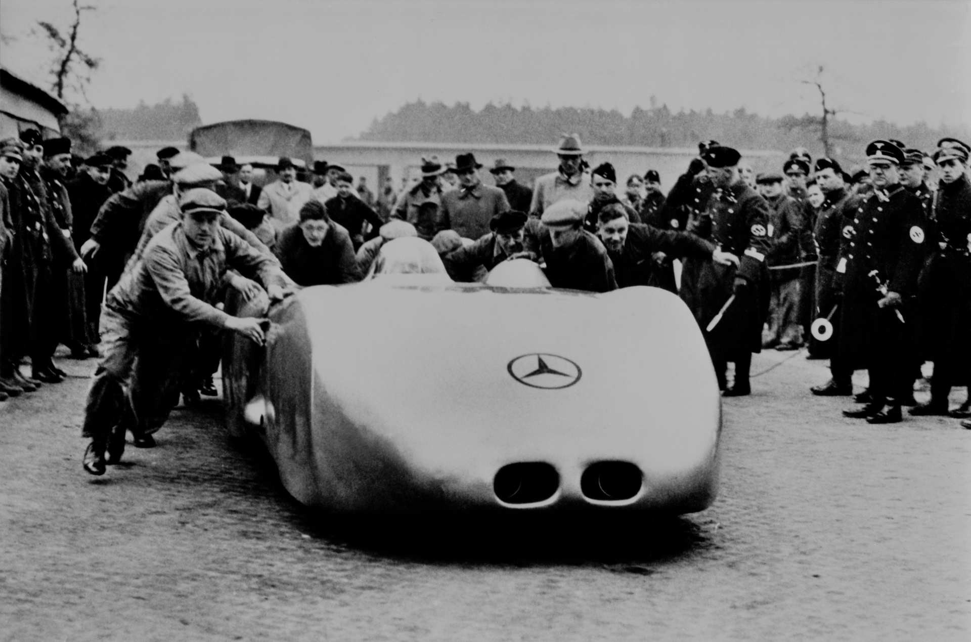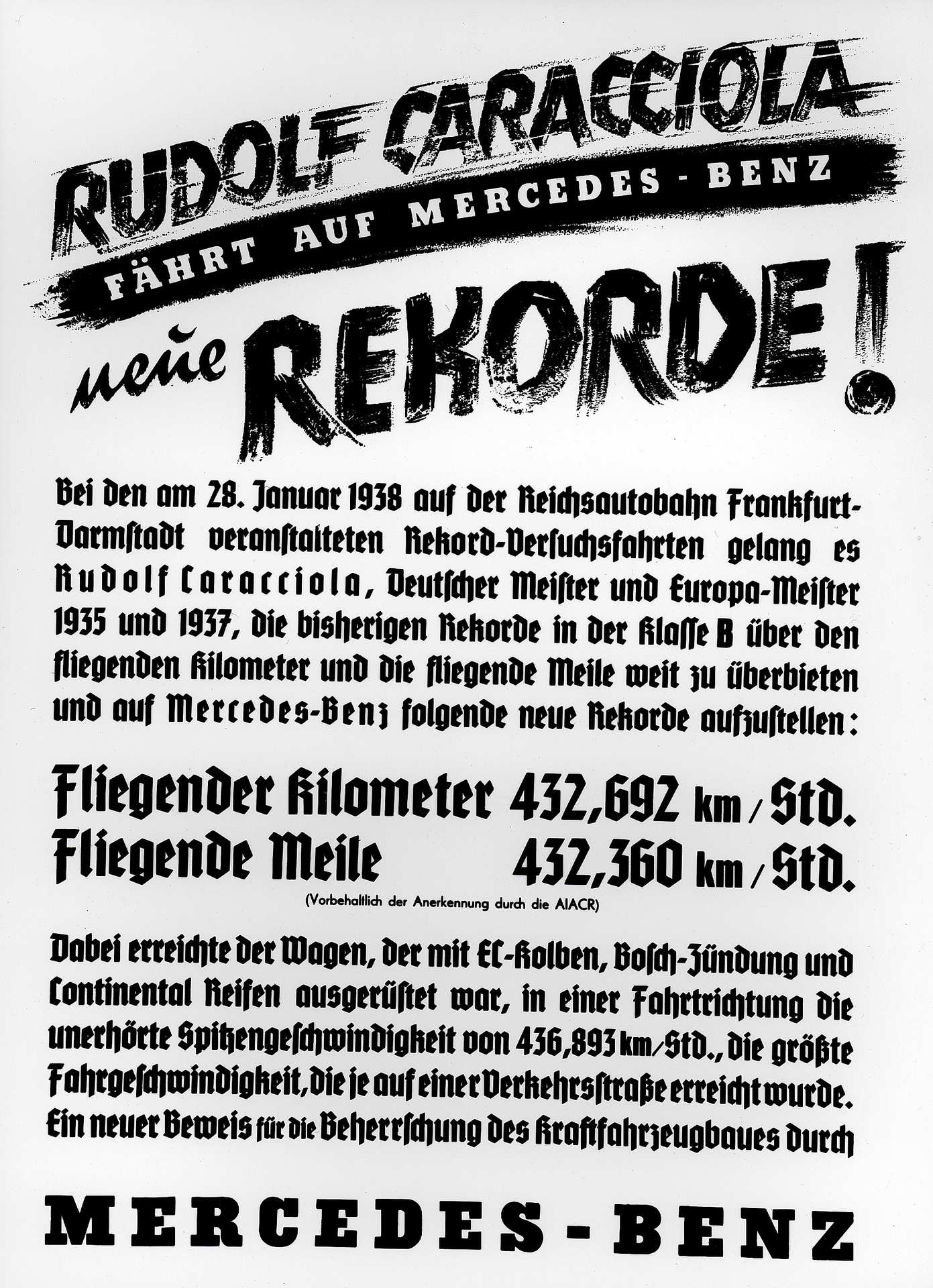 » Далечниот 28 јануари 1938 година беше еден од најважните денови во автомобилската историја – рано утрото Рудолф Карачола на автопатот меѓу Франкфурт и Дармштат со летечки старт помина еден километар со просечна брзина од 432,7 km/h. Овој рекорд во брзина на јавен пат е соборен дури во ноември 2017-тата со Koenigsegg Agera RS кога Никлас Лилја на затворен автопат во Невада постигна 445,6 km/h. Фактот дека рекордот издржа скоро осум децении доволно кажува за моќта на аеродинамично испегланиот болид Mercedes W125 Rekordwagen, долг 6.250, широк 1.850 и висок 1.150 mm, со сензационален коефициент на отпор на воздухот од 0,157.