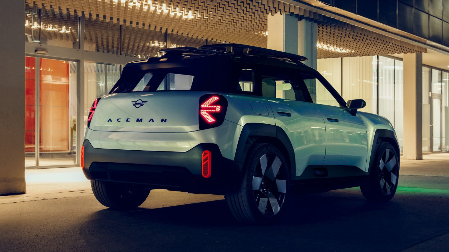 » Ќе бевме посреќни Mini да понудеше некакви технички детали за Aceman освен димензиите, но сепак дизајнот е идејата која ја води приказната. А таа ќе се движи во нова насока наречена харизматична едноставност, која во многу нешта носи свежина меѓу сите варијации на истата тема лансирана со релансирањето на марката под германската диригентска палка. Затоа и обликот на возилото е суштински едноставен – двоволуменски, долг 4,05 и широк 1,99 метри. Огромните 20-инчни тркала се поставени во ќошињата, што е придобивка на електрификацијата. Од истата причина Aceman нема маска, место која е поставена ЛЕД рамка чиј горен внатрешен дел е ЛЕД панел.