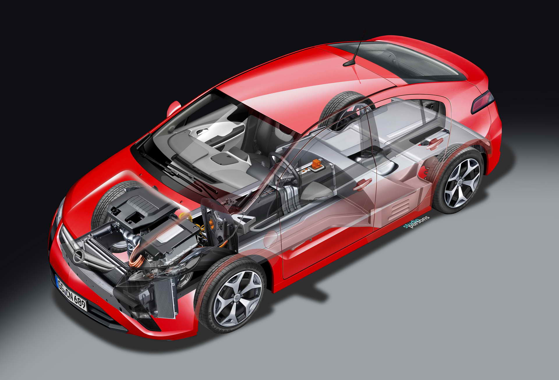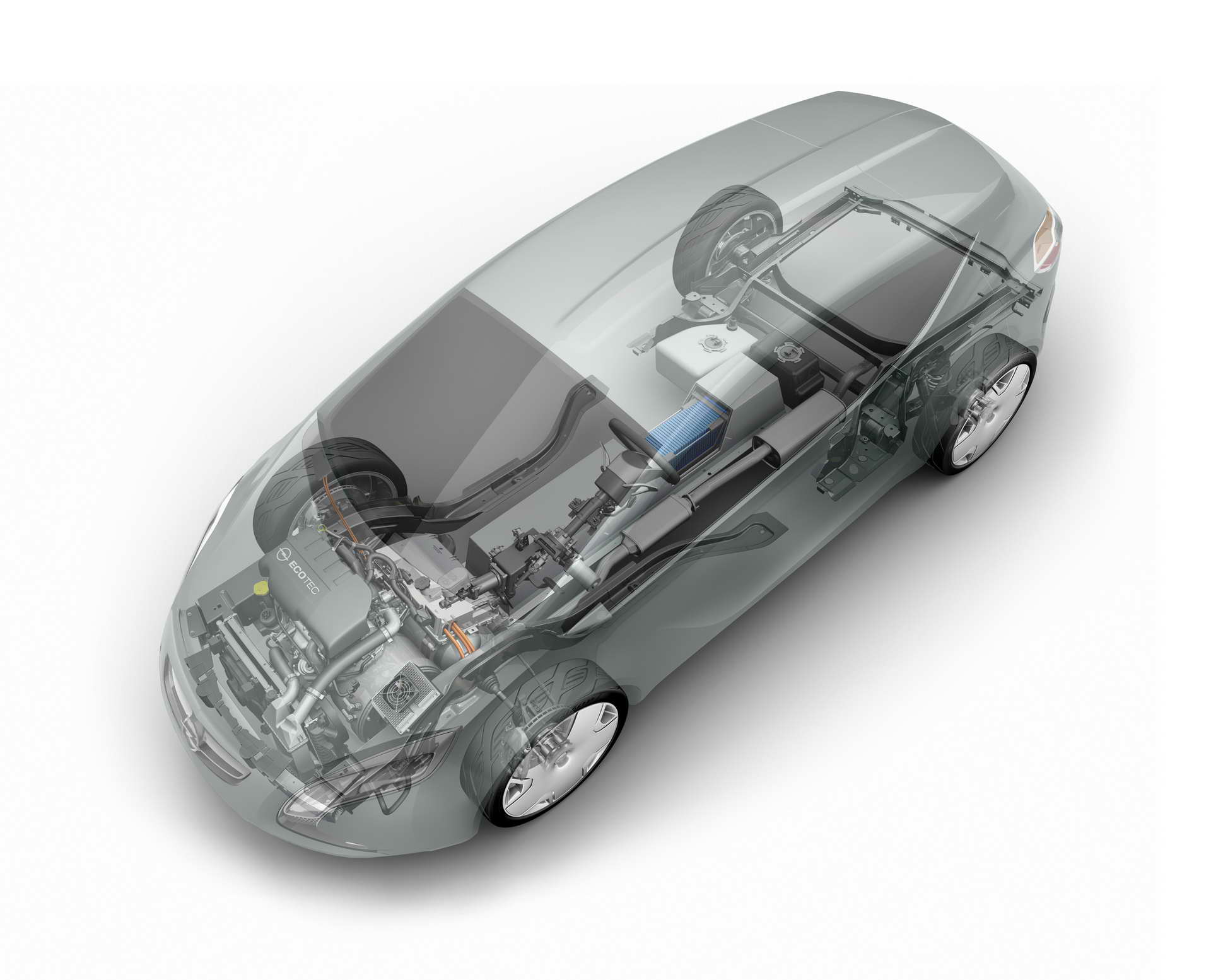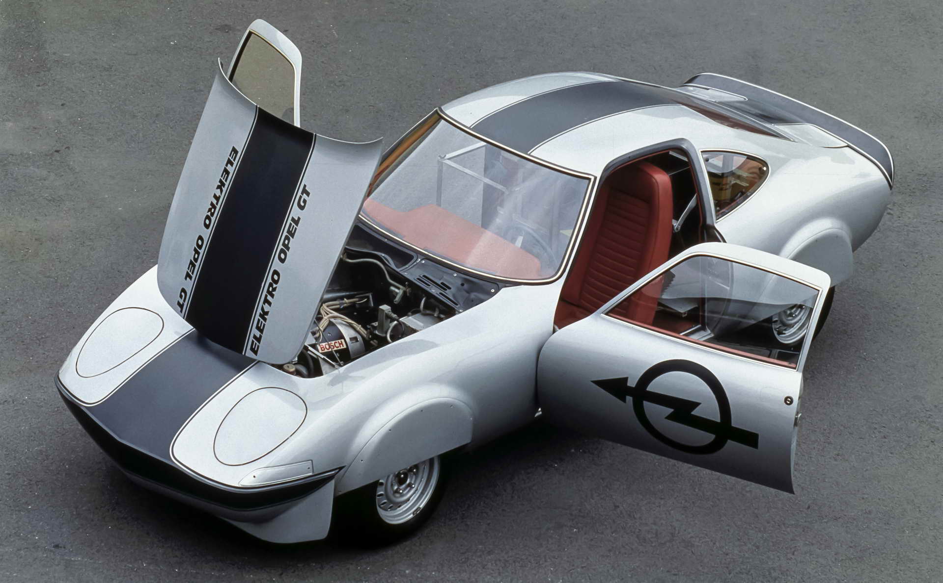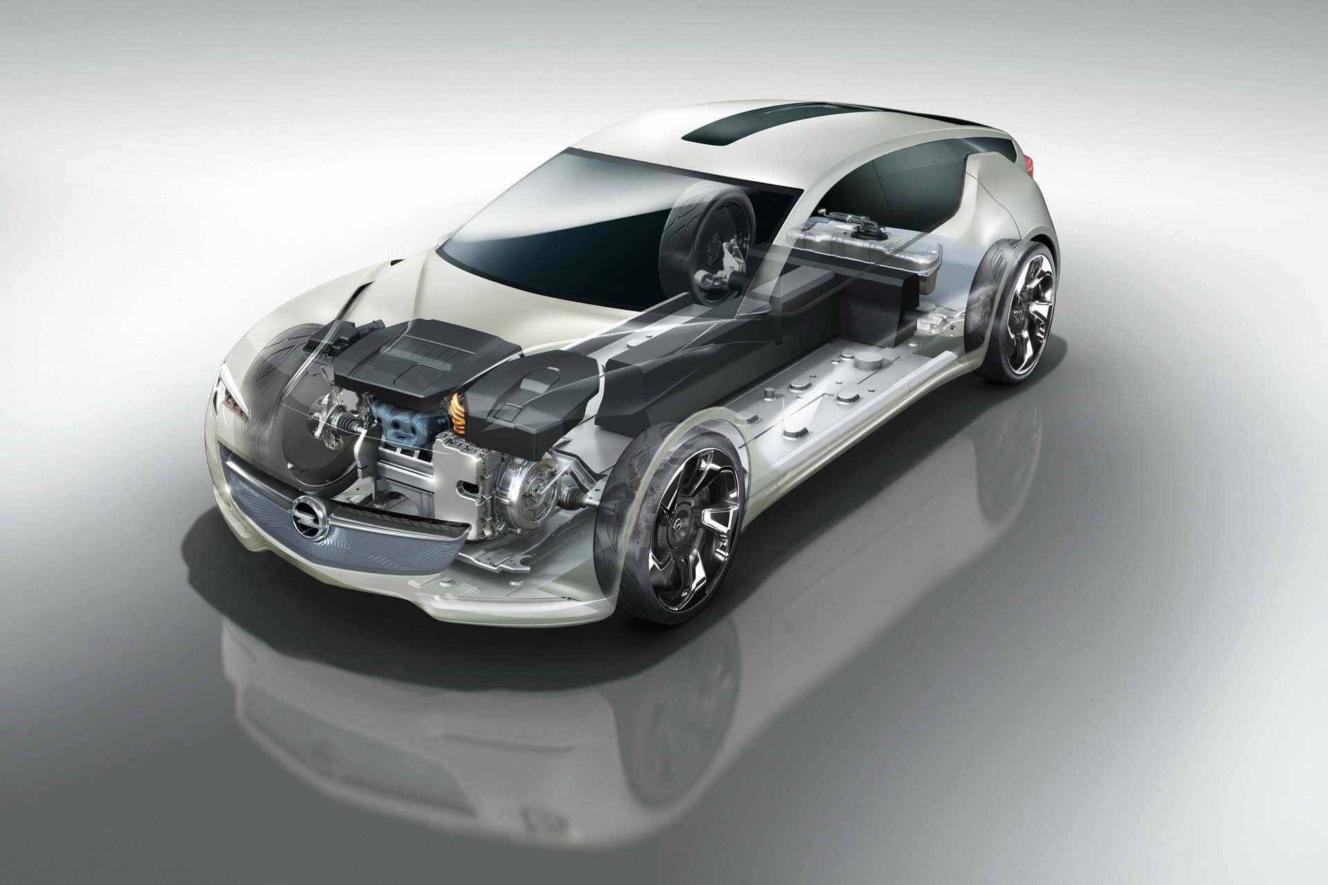 Првите чекори ги направи концептот Stir-Lec I од 1968 година. Тогаш инженерите на General Motors во Kadett B вградија 14 оловни акумулатори за кои струјата ја произведуваше мал стирлингов мотор со надворешно согорување. Три години подоцна внукот на основачот на компанијата Георг фон Опел зад воланот на Elektro-GT собори шест светски рекорди за електричните возила. Возилото беше задвижувано со два споени електромотора што произведуваа 120 KS кои струјата ја добиваа од никел-кадмиум батерии тешки 590 килограми. Автомобилот при константна брзина од 100 km/h имаше автономија од 44 километри.