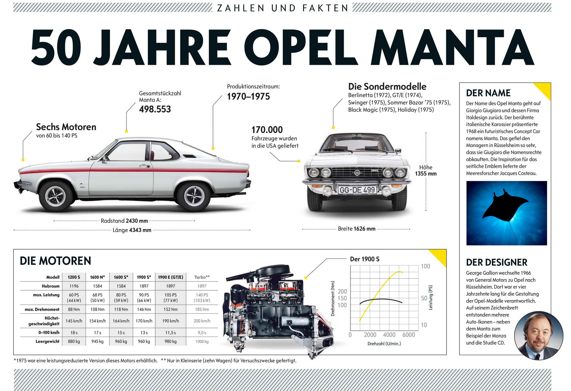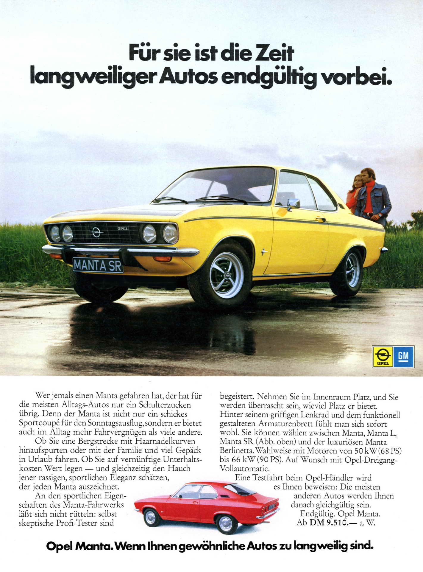 » Со претставувањето на Ascona и Manta, Opel изврши револуција во седумдесеттите години. Ascona беше напреден пример за спортска и забавна за возење лимузина со одлична управливост, меѓутоа Manta беше круна на славата. Елегантното купе ја делеше истата технологија како и Ascona, што го правеше достапно за голем број купувачи. Manta која се појави две години после спортскиот GT беше уште еден автомобил од соништата што германската марка го донесе на пазарот. И двата  нови  модела ги следеа неговите чекори и се продаваа и во САД, како дел од нивната успешна кариера која каква имаат постигнато само неколку автомобили на Opel.