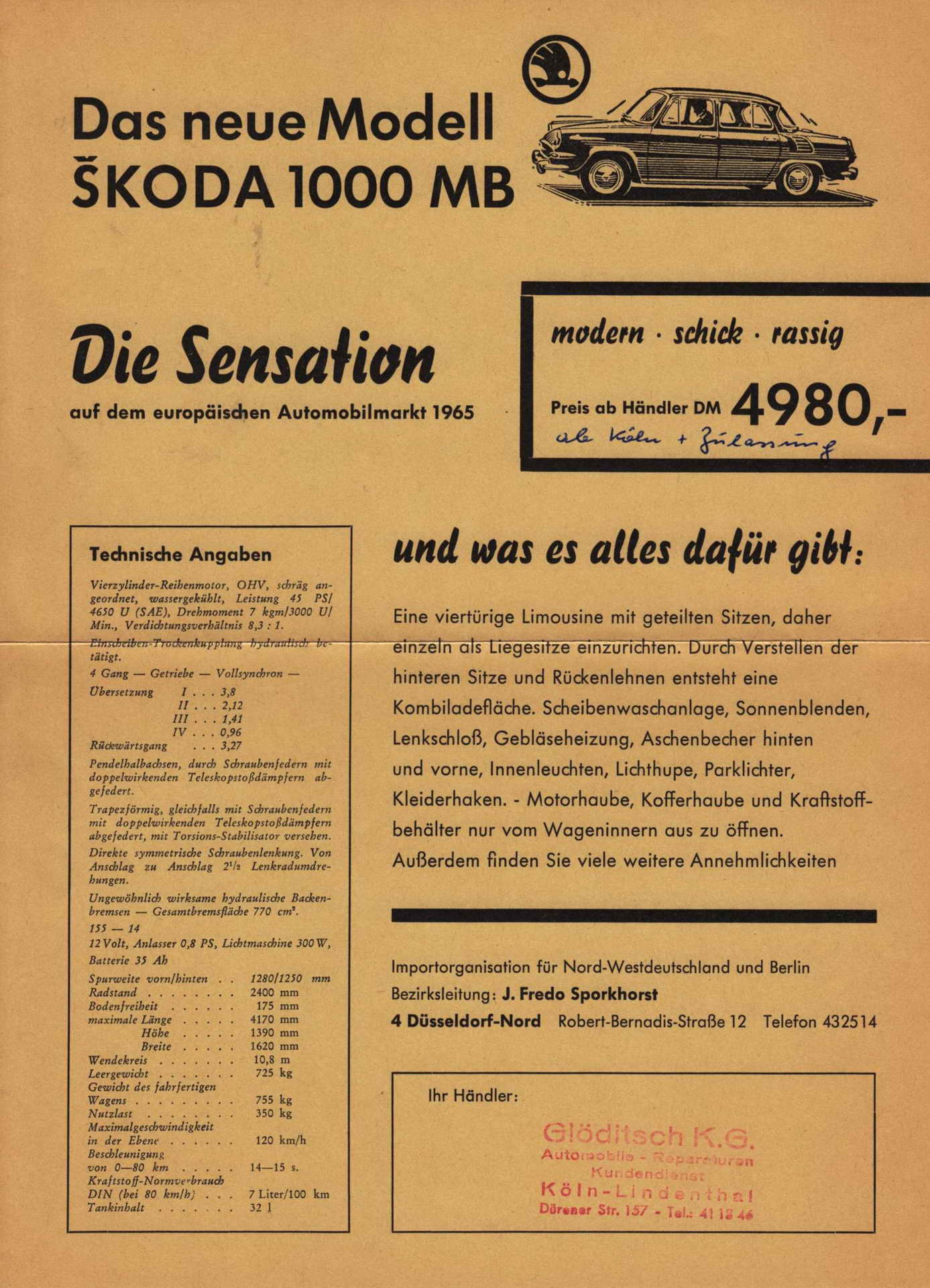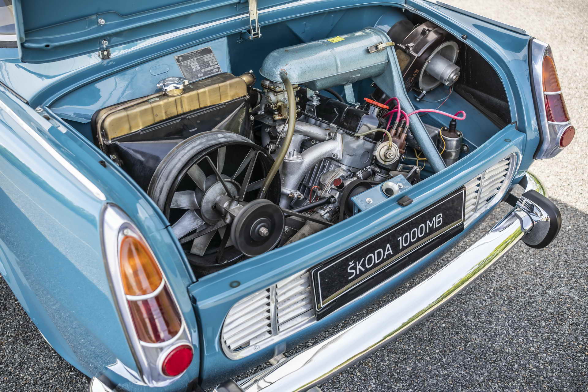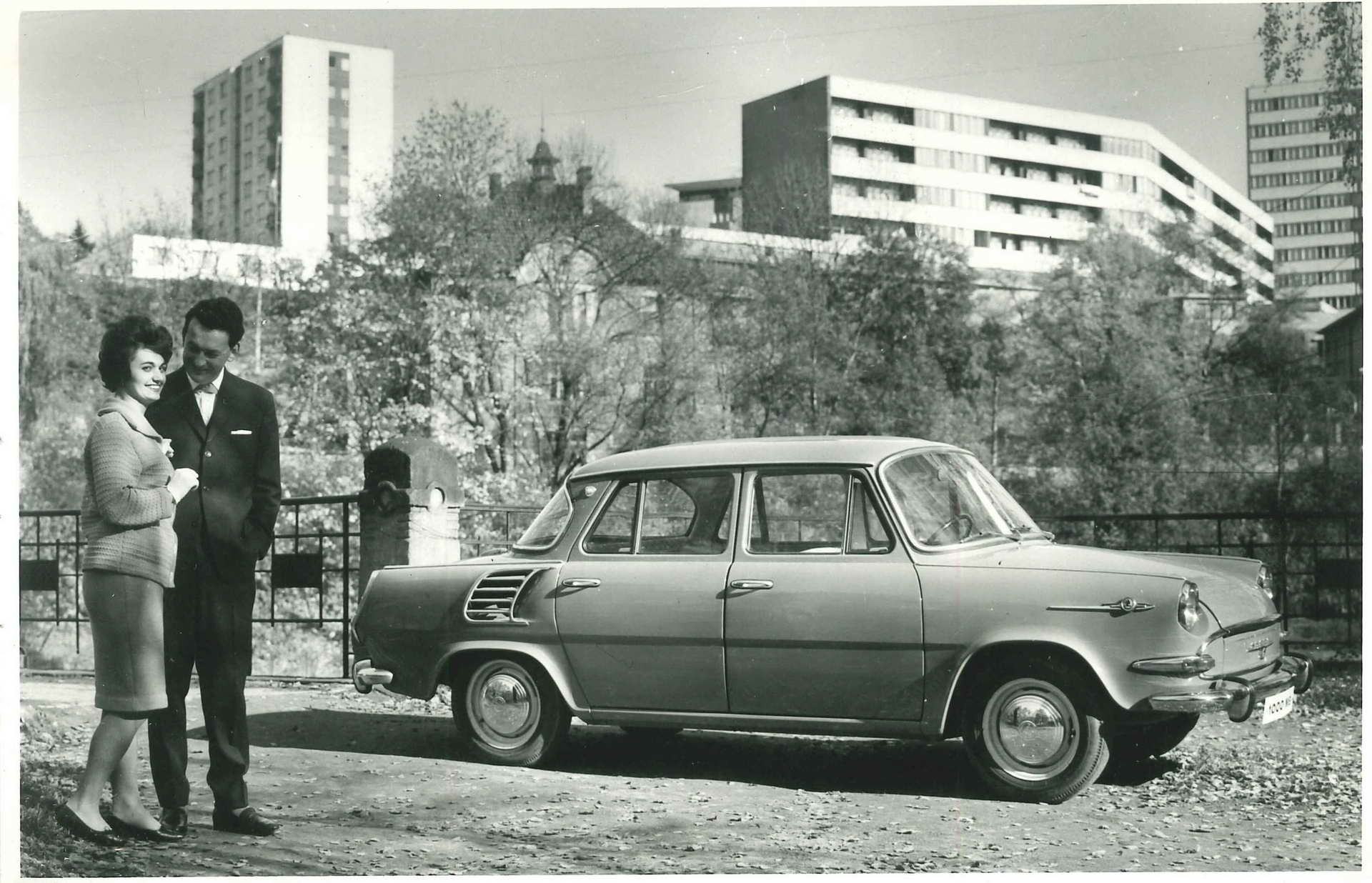 » Škoda 1000 MB ја означи пресвртницата во историјата на чешката марка. За неа беше изграден сосема нов погон во Млада Болеслава, откаде се и буквите во нејзината ознака. Тоа беше напреден и функционален семеен автомобил со независно ослонување. Освен назад сместениот мотор со алуминиумски блок и максимални 37 коњски сили, симпатичната и помалку рустикална лимузина имаше и други интересни решенија. На пример под предниот багажник од 220 литра се наоѓаше посебна преграда за резервното тркало, така што не требаше да се вади багажот за да се дојде до него. Зад задните седишта се наоѓаше уште еден помал простор за багаж, а грлото на резервоарот за гориво беше скриено зад амблемот на марката на предното крило. Од април 1964 до август 1969 година беа произведени 440.639 примероци од кои повеќе од половината за извоз.