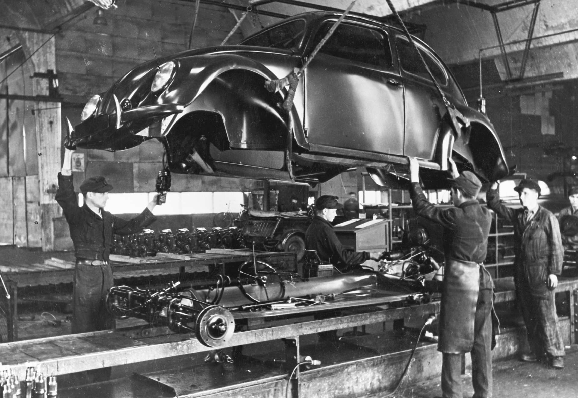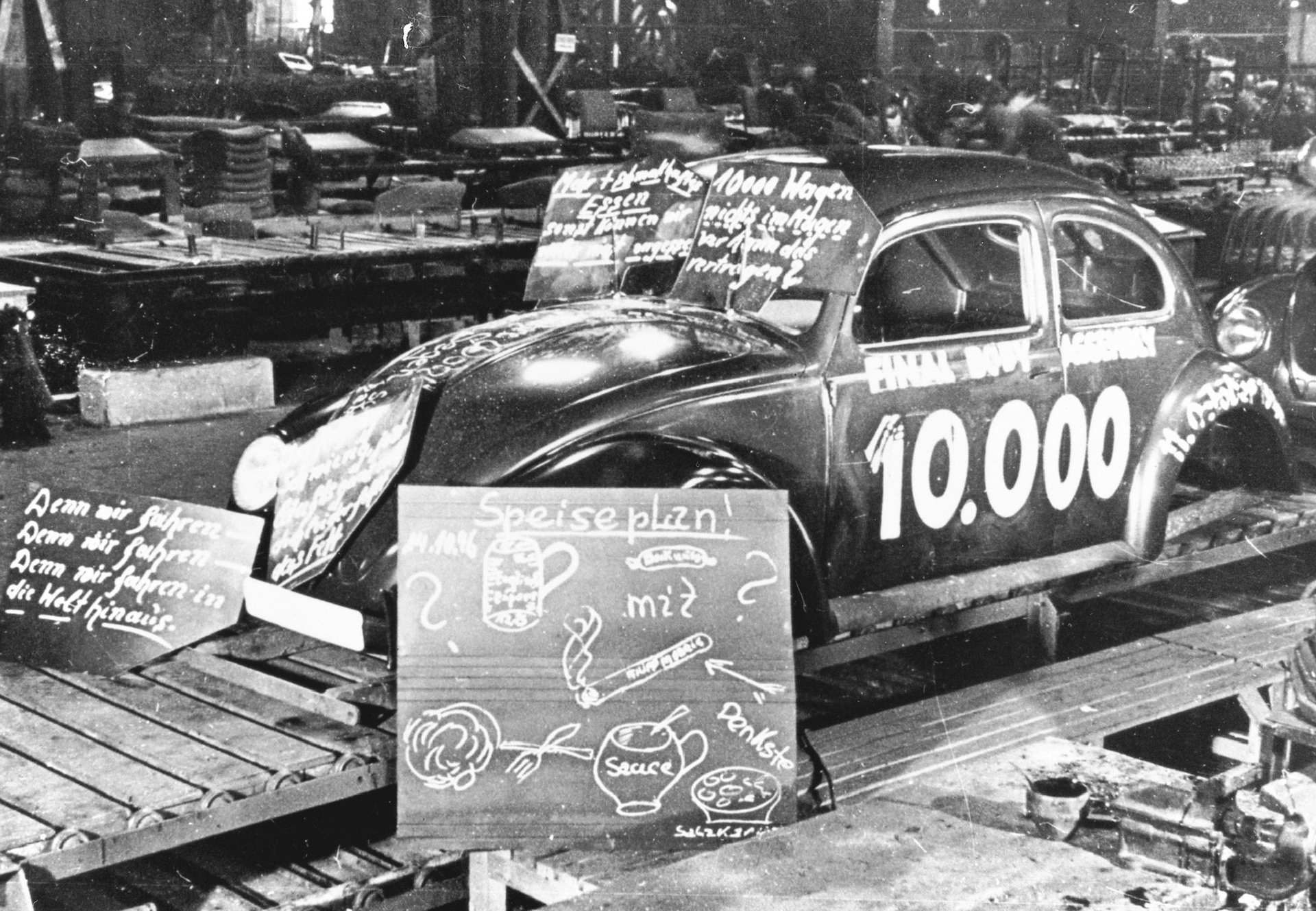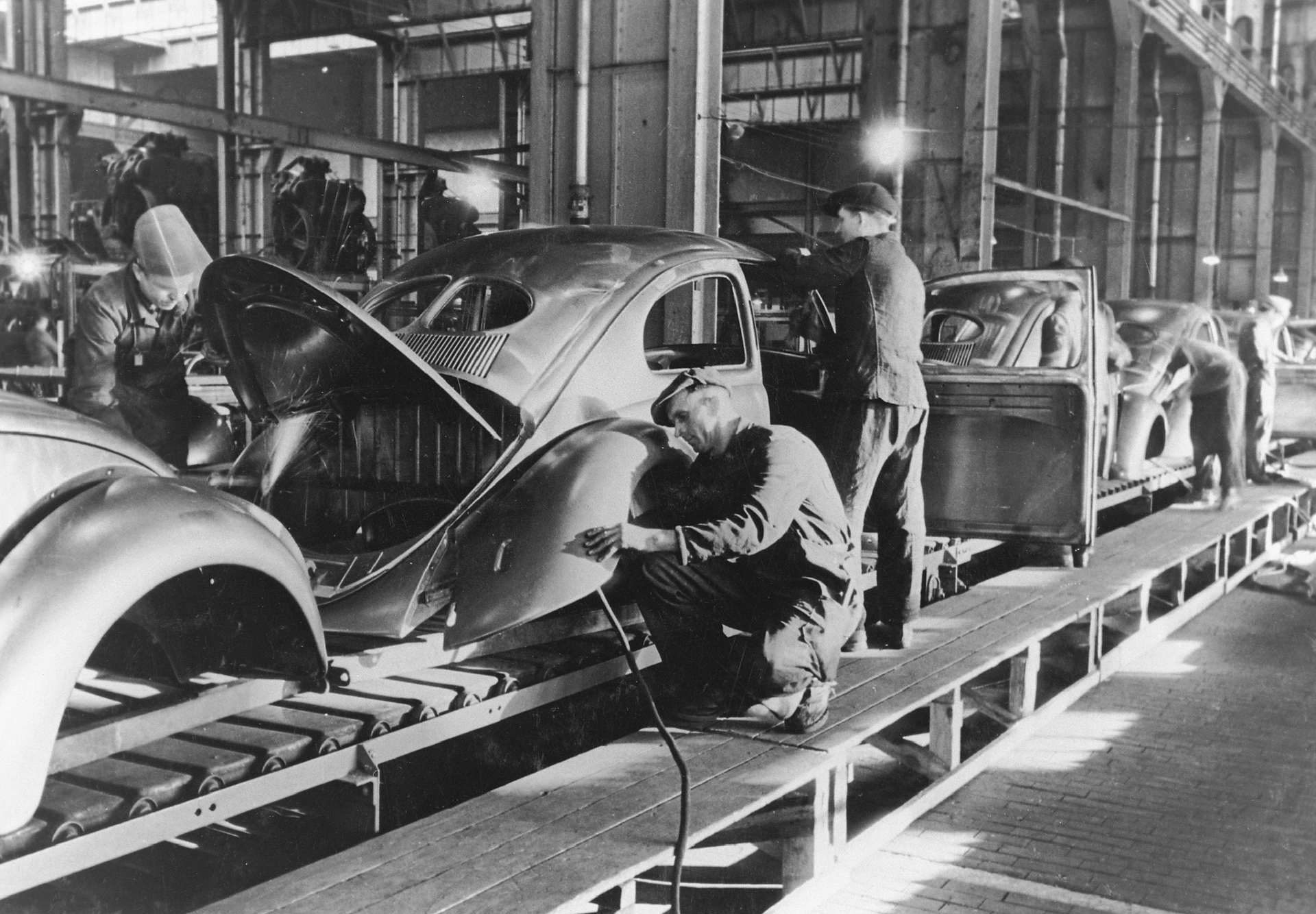 Заради својот низок приоритет фабриката на почетокот не беше цел на сојузничките бомбардери што им даде доволно време на Германците да ги релоцираат машините во подземните бункери и да ги заштитат од уништување. После војната британската окупациска управа планираше да ги пресели во Велика Британија, но оценувајќи дека се работи за застарена технологија и возила кои не би биле привлечни за просечен купувач, ниту една фирма од Островот не беше заинтересирана да ги преземе. Затоа производство на возилата беше обновено на постоечката локација, на почетокот само за потребите на војската, но веќе во 1947 година возилата сега со назив Volkswagen започнаа да се продаваат и на цивилни купувачи, а првите педесетина примероци беа извезени во Холандија.